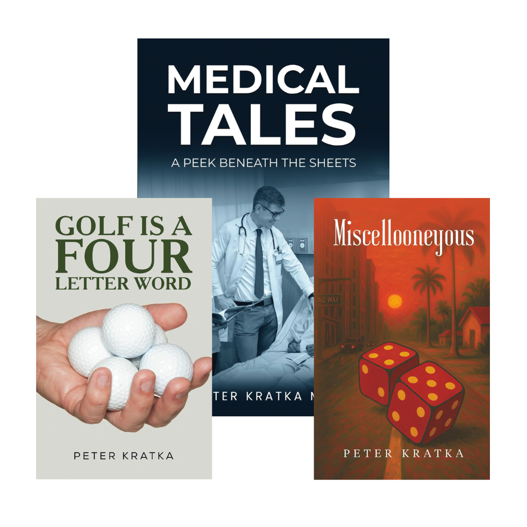 Across his three books, Medical Tales, Golf Is a Four Letter Word, and Miscellooneyous, Kratka doesn’t present the glamorous midlife arc. Instead, he gives us the real stuff: clogged hospital corridors, lost golf balls, irritating neighbors, quiet grief, and the moments that make us stop and laugh when we least expect it.